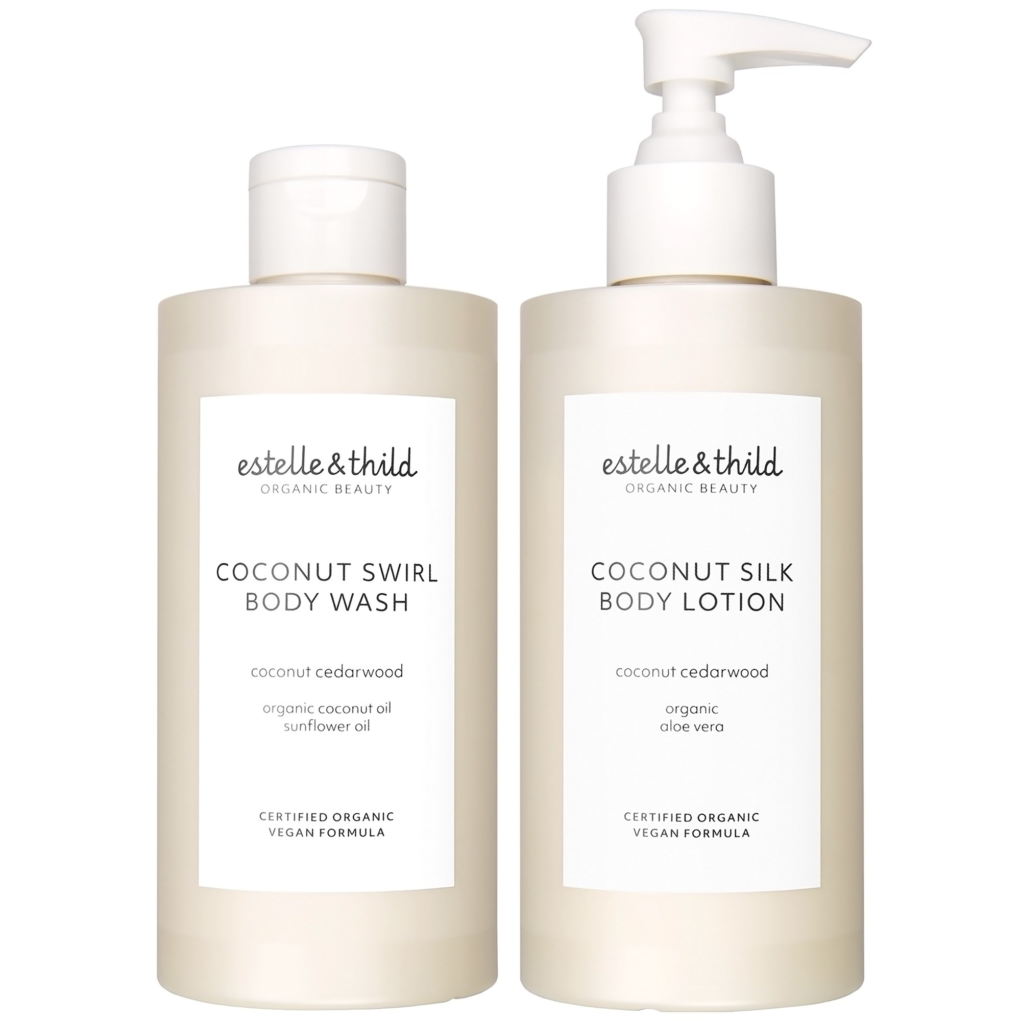Estelle&Thild Organic Beauty Coconut Swirl Body WashEstelle & Thilds bästsäljande serie Coconut Cedarwood utökas med nya och efterlängtade kroppsprodukter. Coconut Swirl Body Wash är en ekologiskt certifierad kroppstvätt som har en doft av oemotståndlig Kokos och sofistikerad Cederträ. Den milda formulan är lätt löddrande och rengör effektivt utan att torka ut, samtidigt som den ger näring på djupet. Resulterar i en ren, fräsch och återfuktad hud. Kroppstvätten består av 99,6% naturliga ingredienser och är berikad med näringsgivande ingredienser som Aloe Vera och kokos. Avsluta gärna med tillhörande Coconut Silk Body Lotion, för ett optimalt resultat. – Naturliga ingredienser: 99,6 %- Ekologiskt Certifierad (COSMOS ORGANIC certifierad av ECOCERT)- Vegansk formula200 mlEstelle&Thild Organic Beauty Coconut Silk Body LotionEstelle & Thilds bästsäljande serie Coconut Cedarwood utökas med nya och efterlängtade kroppsprodukter. Coconut Silk Body Lotion är en ekologiskt certifierad kroppslotion som har en doft av oemotståndlig Kokos och sofistikerad Cederträ. Den mjukgörande och lätta formulan har en silkeslen konsistens som omedelbart tillför näring, samtidigt som den återfuktar huden på djupet. Produkten är snabbabsorberande och lämnar ingen kladdig yta. Formulan består av 99,9 % naturliga ingredienser och är berikad med näringsgivande ingredienser som sheasmör, Aleo Vera och jojobafröolja. Inled gärna med tillhörande Coconut Swirl Body Wash för ett optimalt resultat. – Naturliga ingredienser: 99,9 %- Ekologiskt Certifierad (COSMOS ORGANIC certifierad av ECOCERT)- Vegansk formula200 ml Estelle&Thild Organic Beauty Coconut Cedarwood Coconut Body Duo
